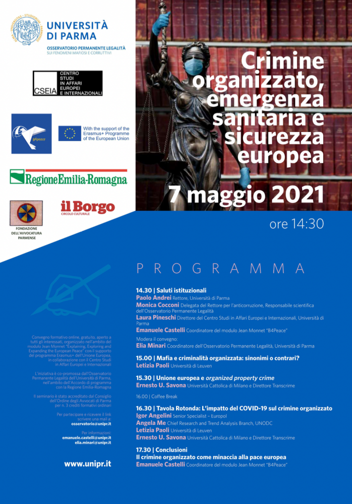 The initiative is organized with the Center for Studies in European and International Affairs of the University of Parma, with the Foundation of Parma Lawyers and co-promoted by the Permanent Observatory on Legality of the University of Parma, in the framework of the Program Agreement with the Emilia-Romagna Region. Patronage of "Il Borgo" Club.