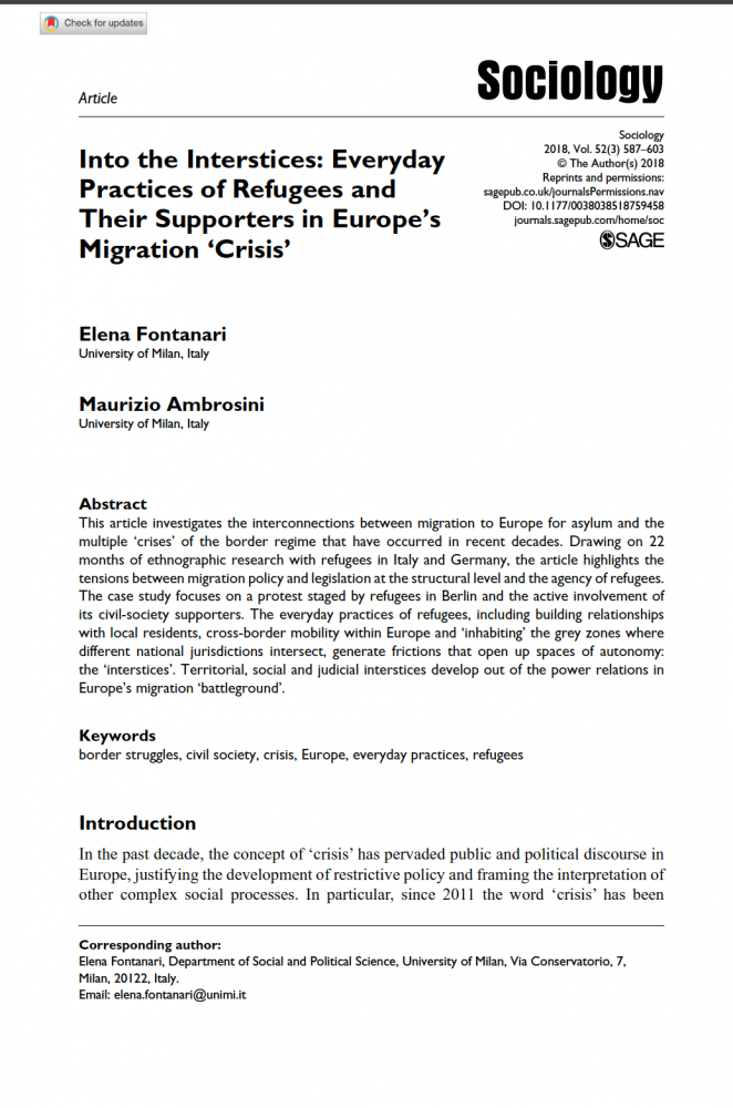 Elena Fontanari, Maurizio Ambrosini (2018), Into the Interstices: Everyday Practices of Refugees and Their Supporters in Europe’s Migration ‘Crisis’, in Sociology, June 2018