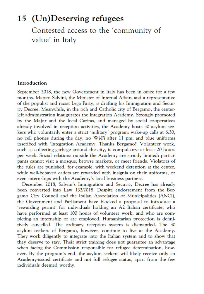 Chiara Marchetti, (Un)Deserving Refugees: Contested Access to the 'Community of Value' in Italy, in Europe and the Refugee Response A Crisis of Values? By Elżbieta M. Goździak, Izabella Main, Brigitte Suter, Routledge