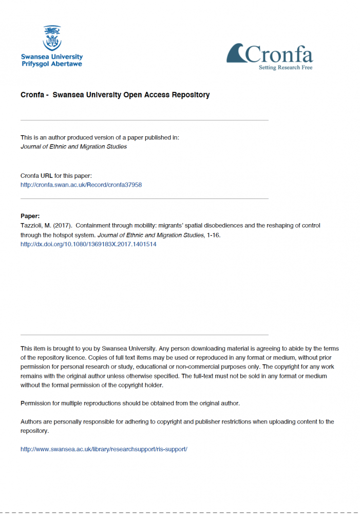 Tazzioli, M. (2017). Containment through mobility: migrants’ spatial disobediences and the reshaping of control through the hotspot system. Journal of Ethnic and Migration Studies, 1-16.
