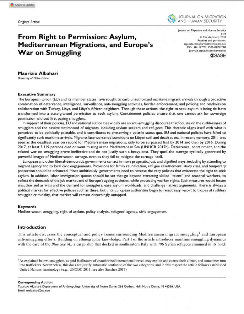 Albahari, Maurizio. "From right to permission: Asylum, Mediterranean migrations, and Europe’s war on smuggling." Journal on Migration and Human Security 6.2 (2018): 121-130