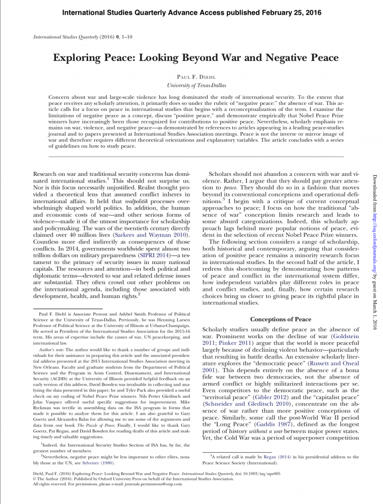 Diehl, P. F. (2016). Exploring peace: Looking beyond war and negative peace. International Studies Quarterly, 60(1), 1-10