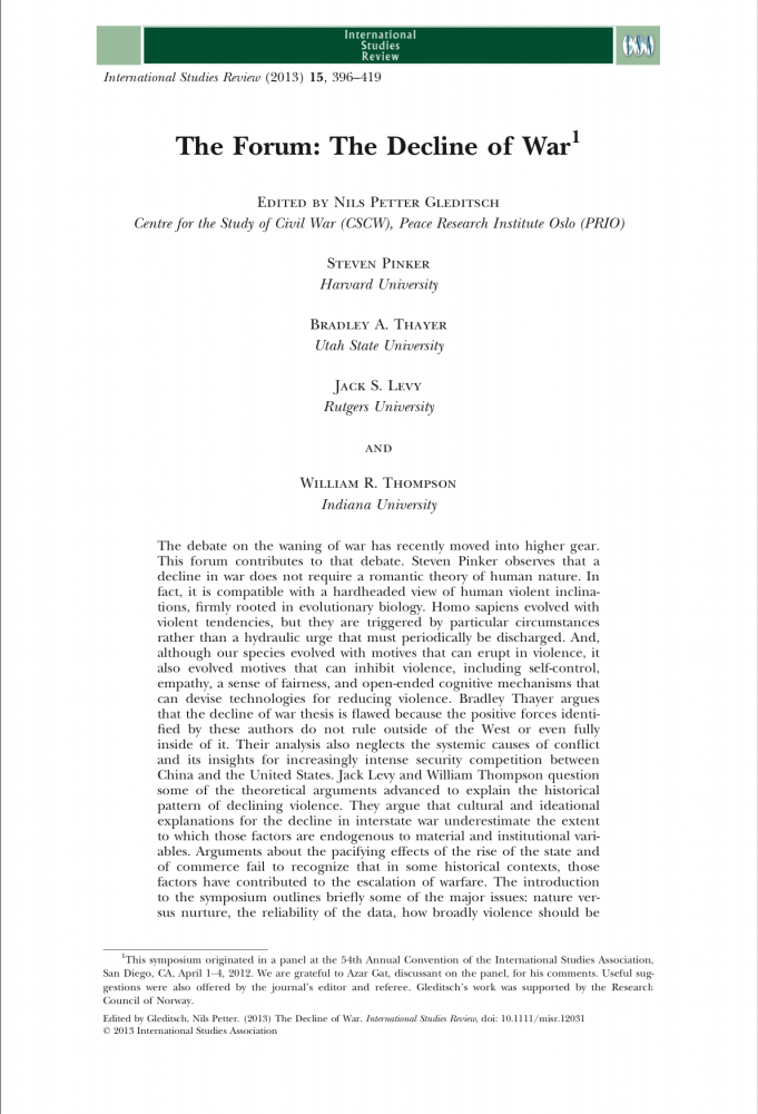 Gleditsch, N. P., Pinker, S., Thayer, B. A., Levy, J. S., & Thompson, W. R. (2013). The forum: The decline of war. International Studies Review, 15(3), 396-419.