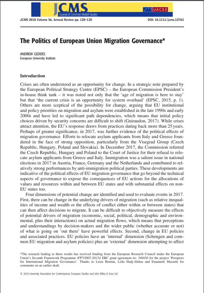 Geddes, Andrew. "The politics of European Union migration governance." Journal of common market studies 56 (2018): 120-130.