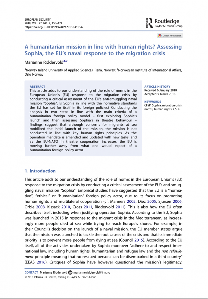 Riddervold, M. (2018) A humanitarian mission in line with human rights? Assessing Sophia, the EU’s naval response to the migration crisis, European Security, 27:2,2018.