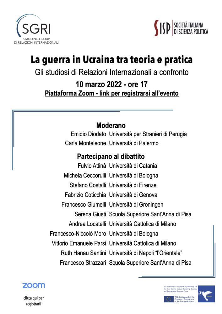 Lo Standing Group di Relazioni Internazionali della Società Italiana di Scienza Politica, in partnership con B4Peace, ha organizzato un instant seminar sulla guerra in Ucraina, un dibattito tra i principali studiosi italiani di Relazioni internazionali su cause e conseguenze del conflitto. L'evento si terrà sulla piattaforma Zoom giovedì 10 marzo 2022 alle ore 17 e sarà aperto a tutti.