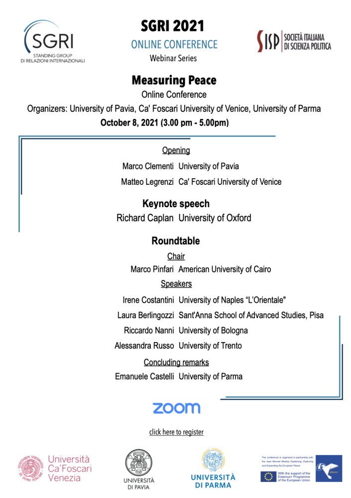 Nel corso dell'evento, dal titolo Measuring Peace, si terrà una keynote speech del Prof. Richard Caplan (Oxford University), a cui seguirà una tavola rotonda.